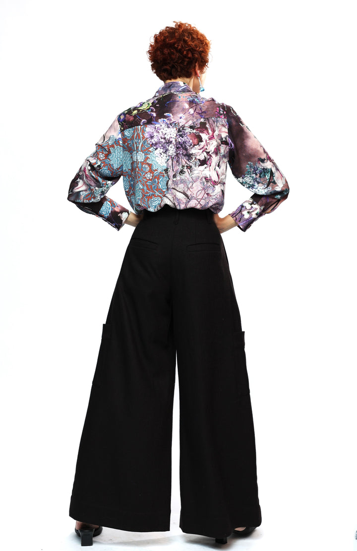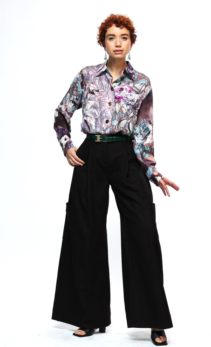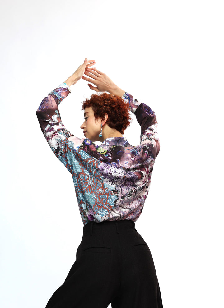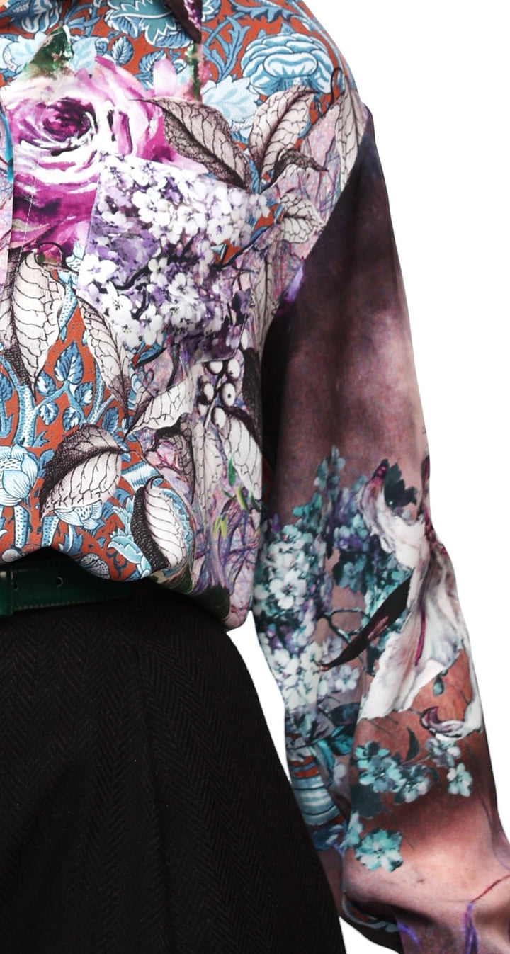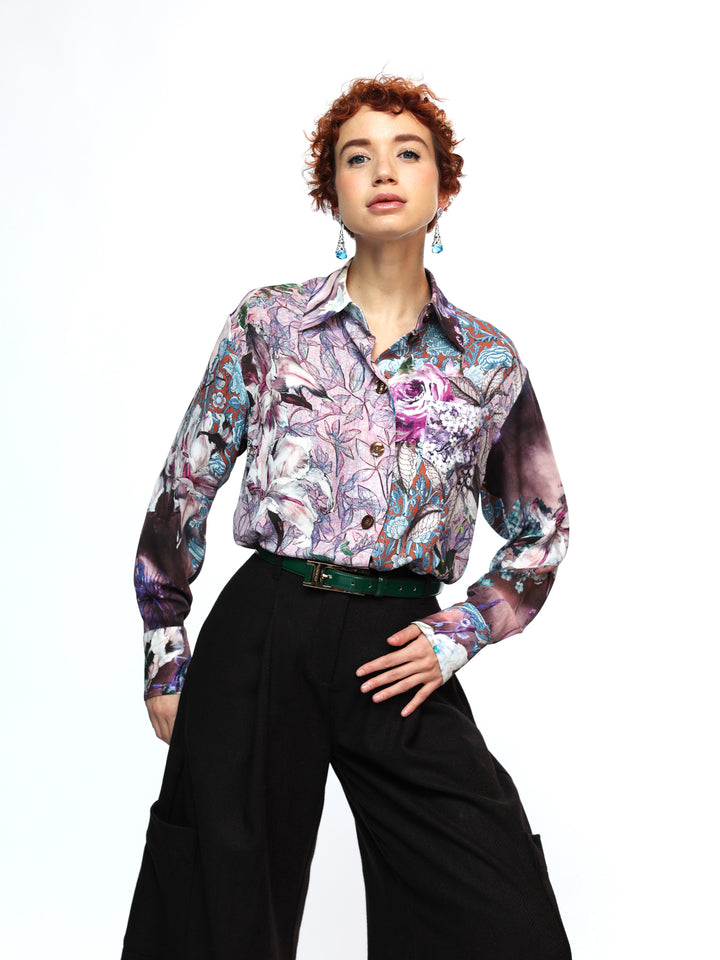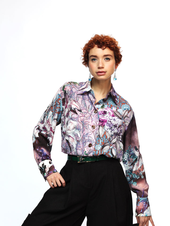 Very stylish silk blouse, decorated by multicolor flower pattern. The color matches with absolutely any trousers or suit.
