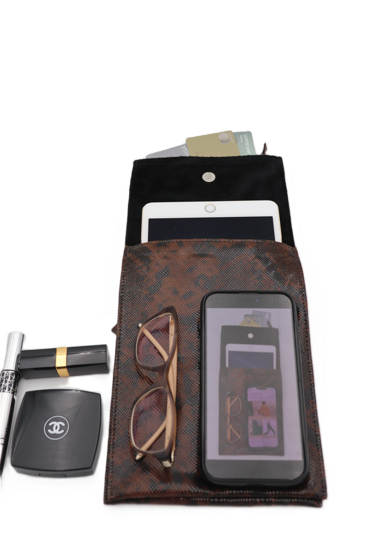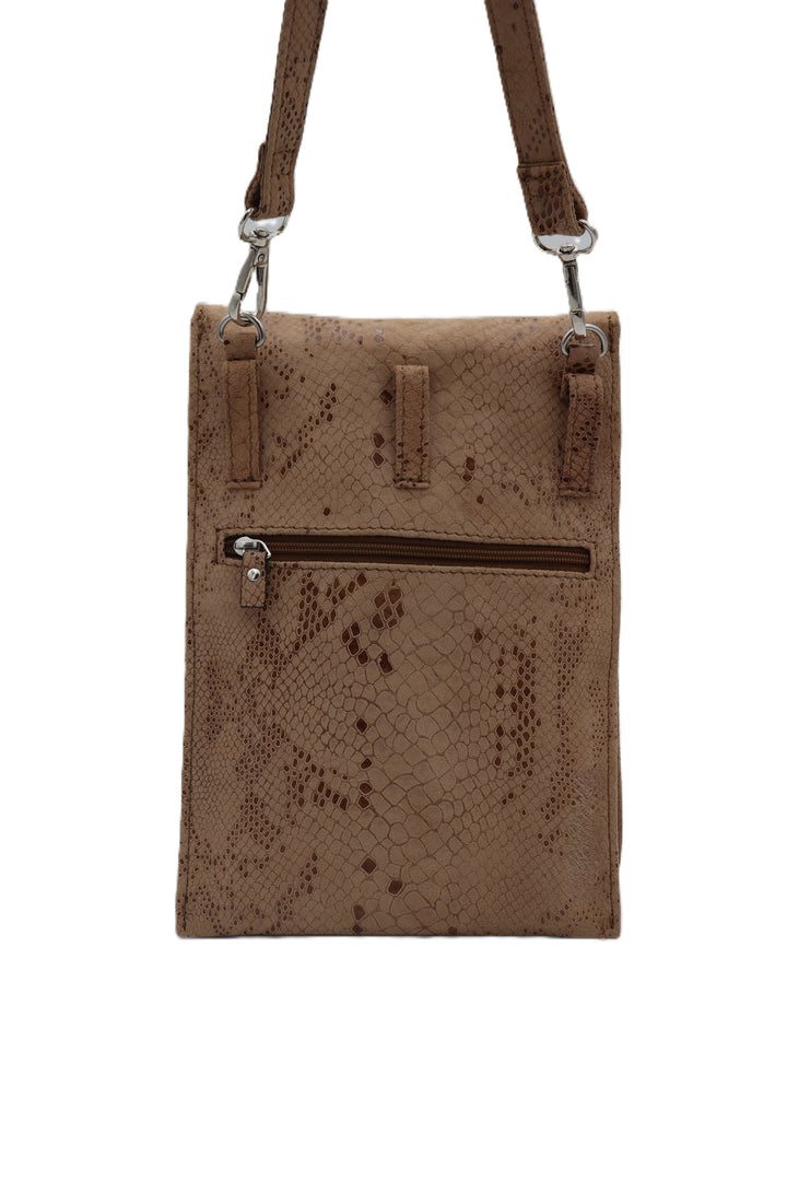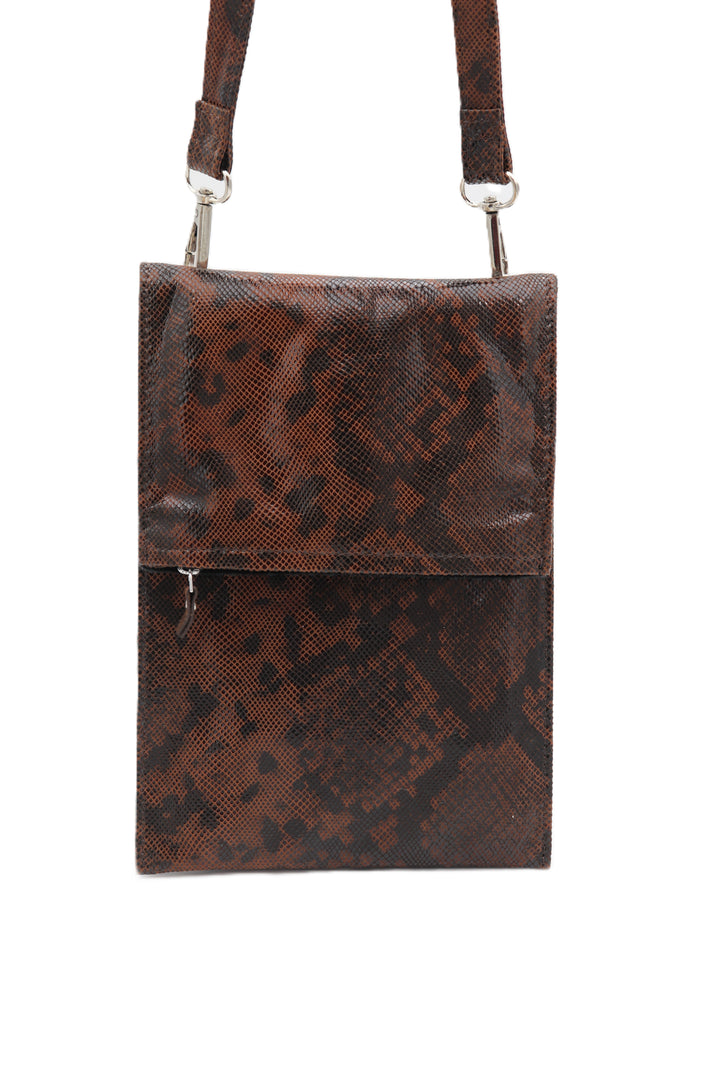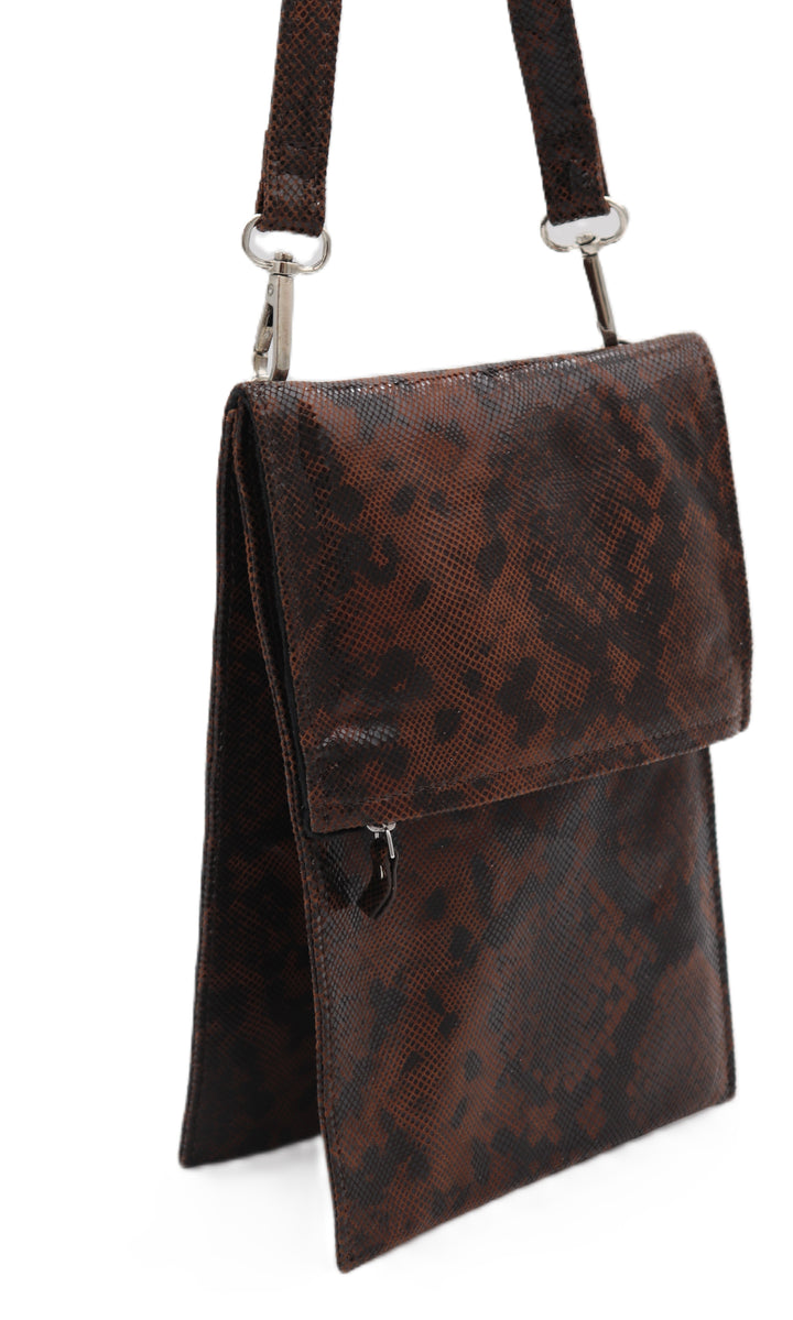 Sophisticated leather bag with embossed snake pattern and velvet lining. Wear as a crossbody or waist bag for versatile styling. Two zippered pockets and compartments keep essentials organized. Ultra-slim profile fits discreetly under outerwear while accommodating a mini iPad, wallet, and daily necessities. 24 x 16 cm. Refined functionality for everyday and occasion wear.